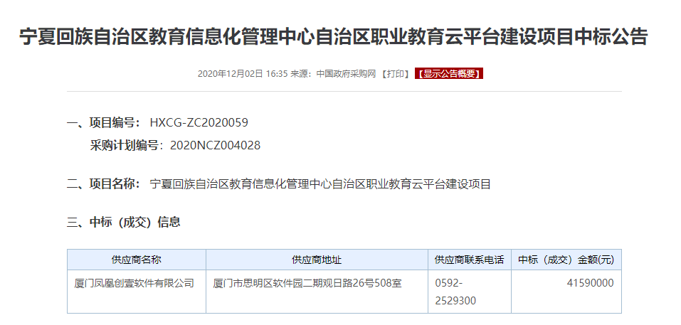 4159萬元!鳳凰創(chuàng)壹中標(biāo)寧夏職業(yè)教育云平臺項目