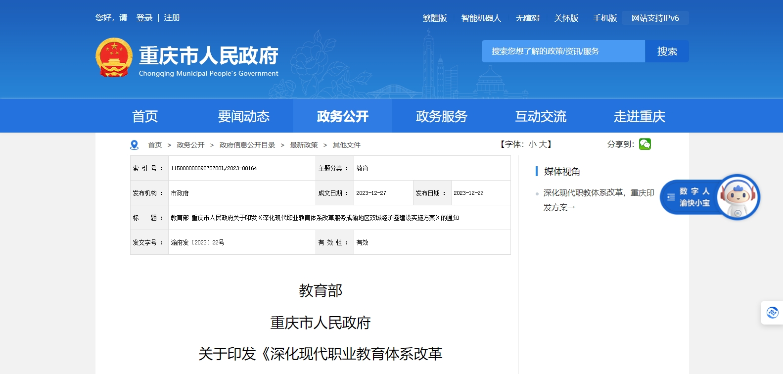 教育部、重慶市人民政府印發(fā)《深化現代職業(yè)教育體系改革 服務成渝地區(qū)雙城經濟圈建設實施方案》的通知